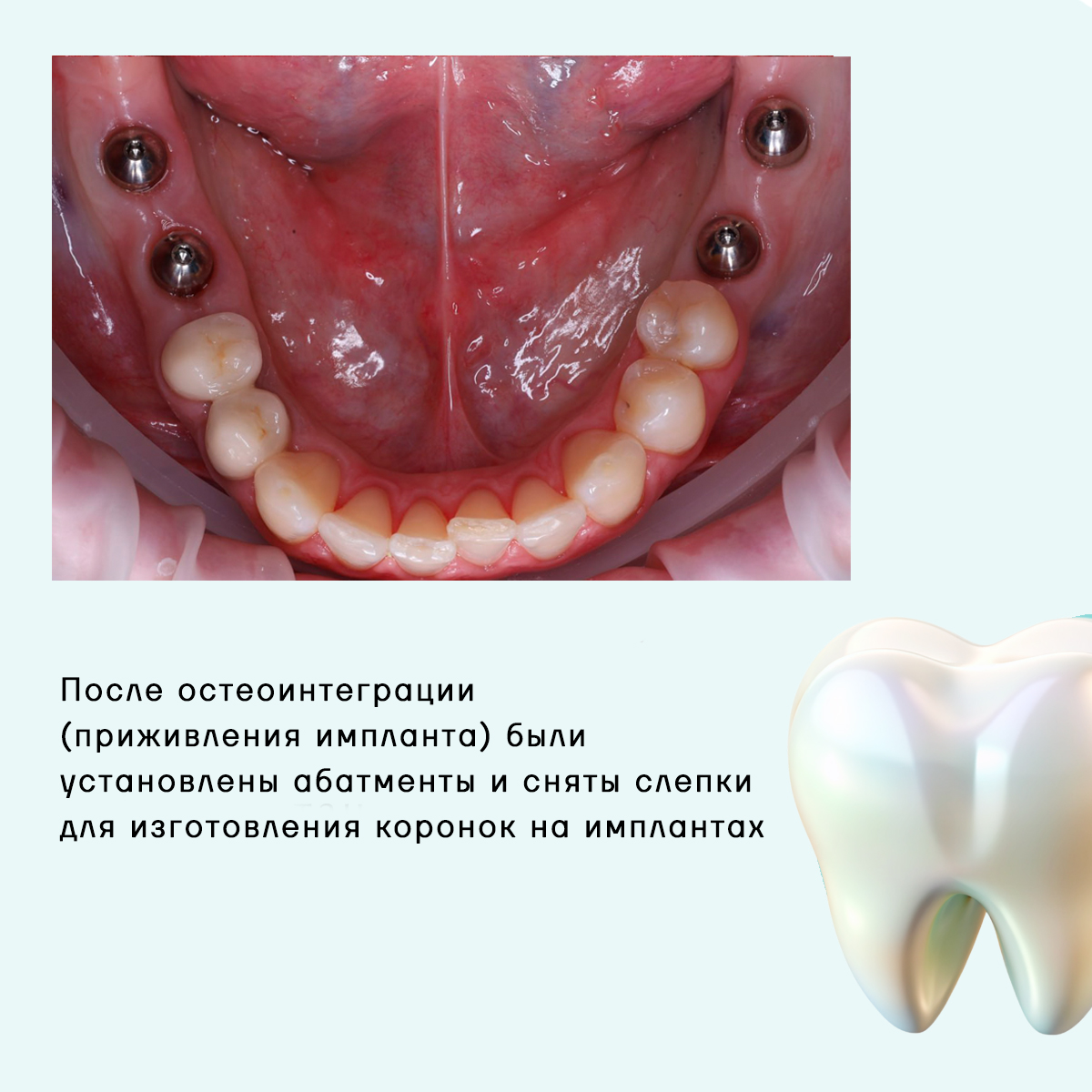 Далее после заживления, когда контуры десны вокруг имплантов сформированы, доступ к винтовым каналам открыт — челюсть готова к ортопедическому этапу. Были сняты точные цифровые слепки с трансферами, подобраны или изготавлены абатменты для поддержки сформированного профиля выхода.