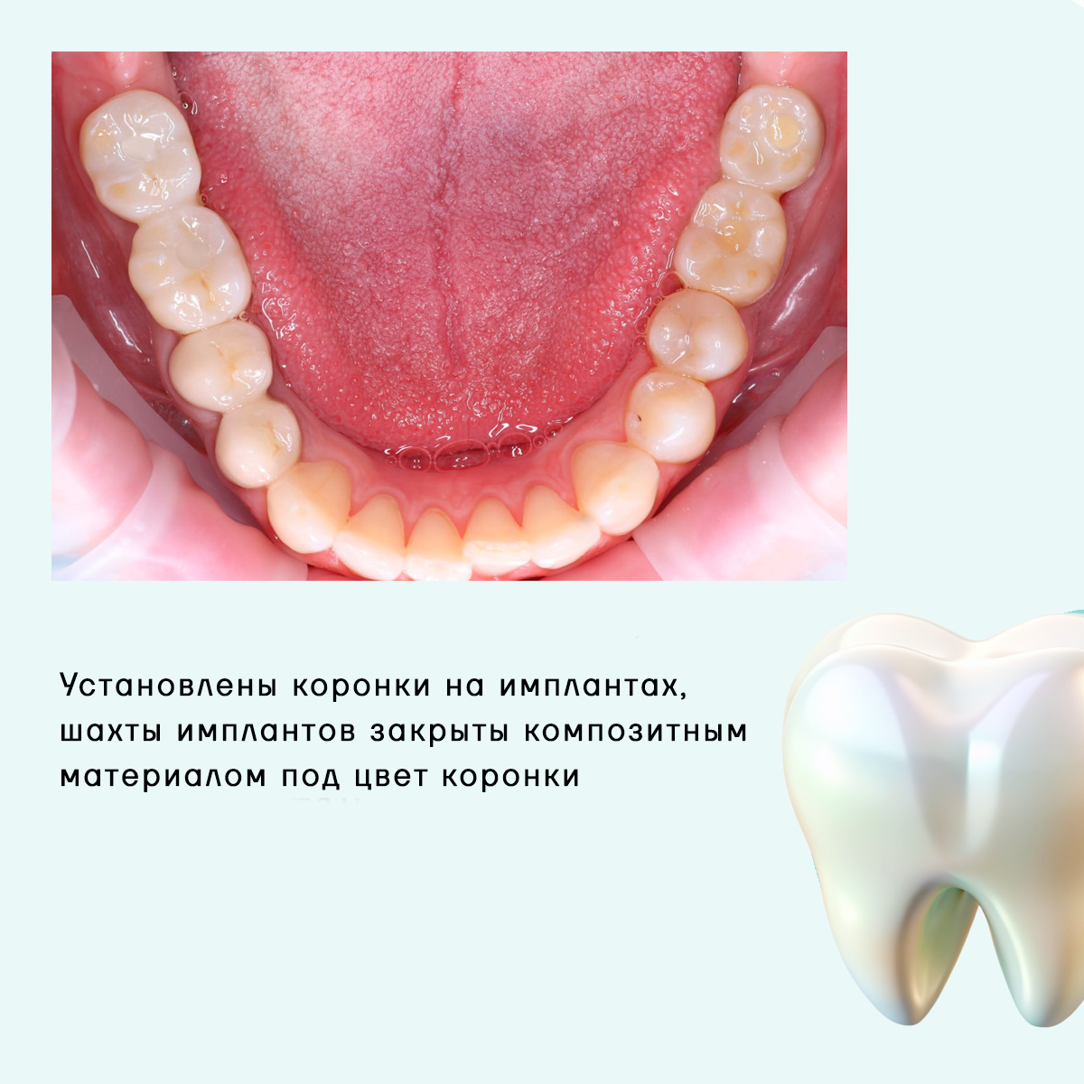 На фото: коронки уже установлены, доступы к винтам аккуратно запечатаны композитом под цвет, контакты и прикус выверены.
