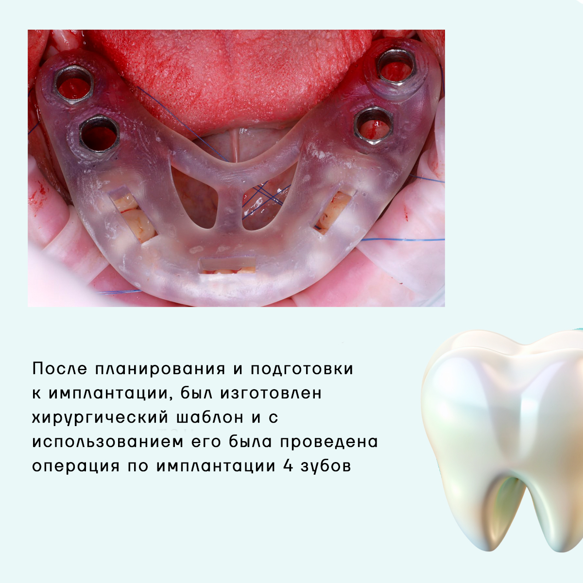 Установка имплантов прошла симметрично, через шаблон импланты устанавливаются минимально травматично.